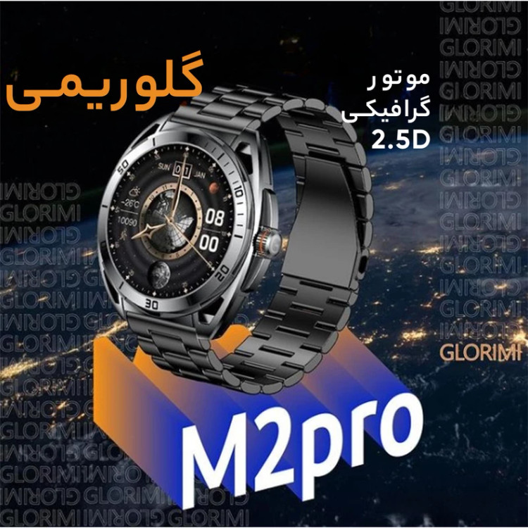 ساعت هوشمند گلوریمی مدل M2 Pro، مناسب برای ورزش، روزمره، دارای قابلیت‌های صفحه نمایش رنگی و لمسی، کنترل موسیقی، قابلیت مکالمه از طریق بلوتوث، پشتیبانی از زبان فارسی در منو و سیستم‌عامل، بند سیلیکون، فرم صفحه دایره، فناوری GPS