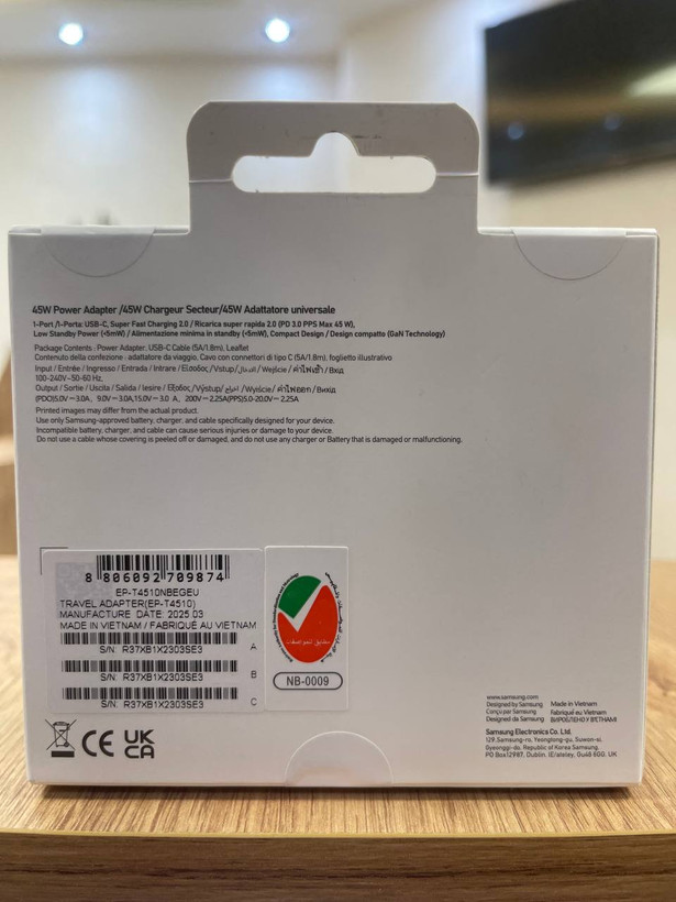 شارژر دیواری 45 وات سامسونگ مدل EP-T4510 با اتصال به پریز سه پین و تکنولوژی شارژ سریع USB PD 1.0، دارای درگاه خروجی USB Type-C، به همراه کابل USB Type-C به طول 180 سانتی‌متر